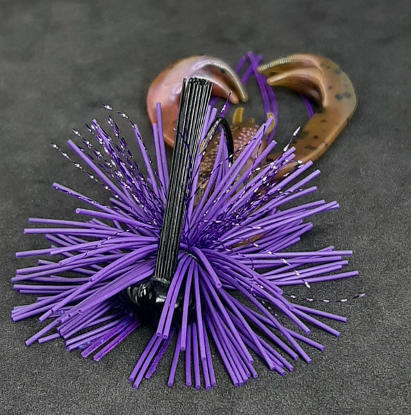 The Mr B Puffball Jig is the ultimate in finesse but still offers a big bass what it wants…a tasty crawdad. A super sticky 2/0, Owner Deep-Throat Hook is surrounded by a hand-tied masterpiece the fish just can’t resist. Owners special angled-bend of the Deep-Throat hook does a great job of keeping your trailer in place and won’t let it slide down the hook. This is a Smallmouth and Spot killer but the Largemouth love it too. Combination of Large, Round, Living-Rubber and Silicone, the Puffball has a delicate and subtle appearance that drives the fish wild. We use a softer, Medium-Stiffness Weedguard on this jig so that light line and deep-water hooksets are a breeze. The Powder Painted head has been fully baked and is super chip resistant.